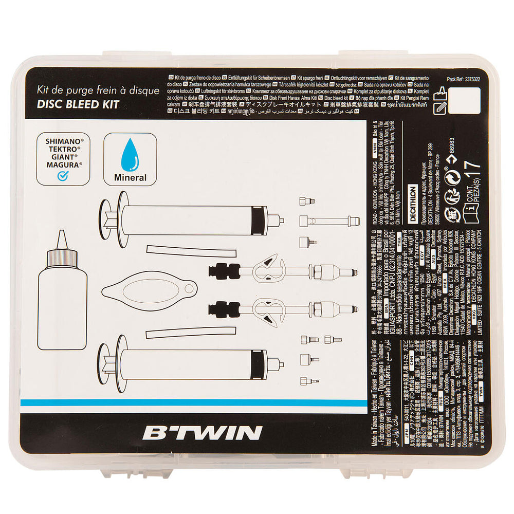 Bleeding kit for mineral oil Shimano®, Magura®, Tektro®, and Giant® hydraulic disc brakes. This kit enables you to maintain your brakes to improve their performance.