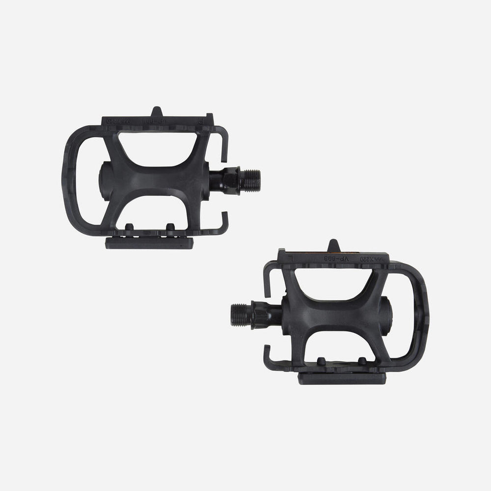 Our 100 flat pedals are made from resin and designed for adults doing recreational mountain biking or riding a hybrid bike.