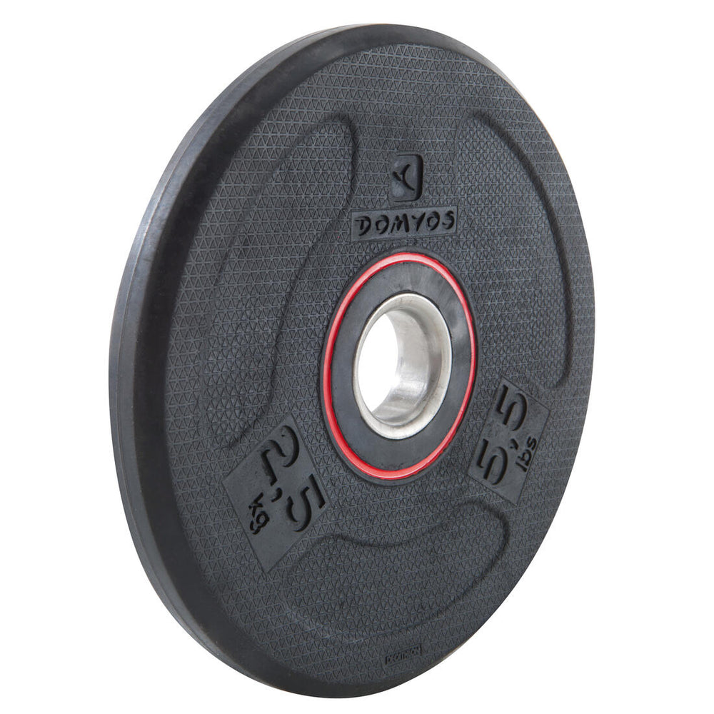 This rubber weight disc is compatible with 28 mm diameter bars including the following: - 1.2 metre straight bar (ref.: 8289897) - 1.2 metre curl bar (ref.: 8484124) - 86 cm triceps bar (ref.: 8484125) - 35 cm short bar (ref.: 1041986) - 45 cm threaded bar (ref.: 8766096) - 1.55 m straight bar (ref.: 8289896) - 2 m straight bar (ref.: 8289900) However, this weight is not compatible with Olympic weight-lifting bars (50 mm diameter).