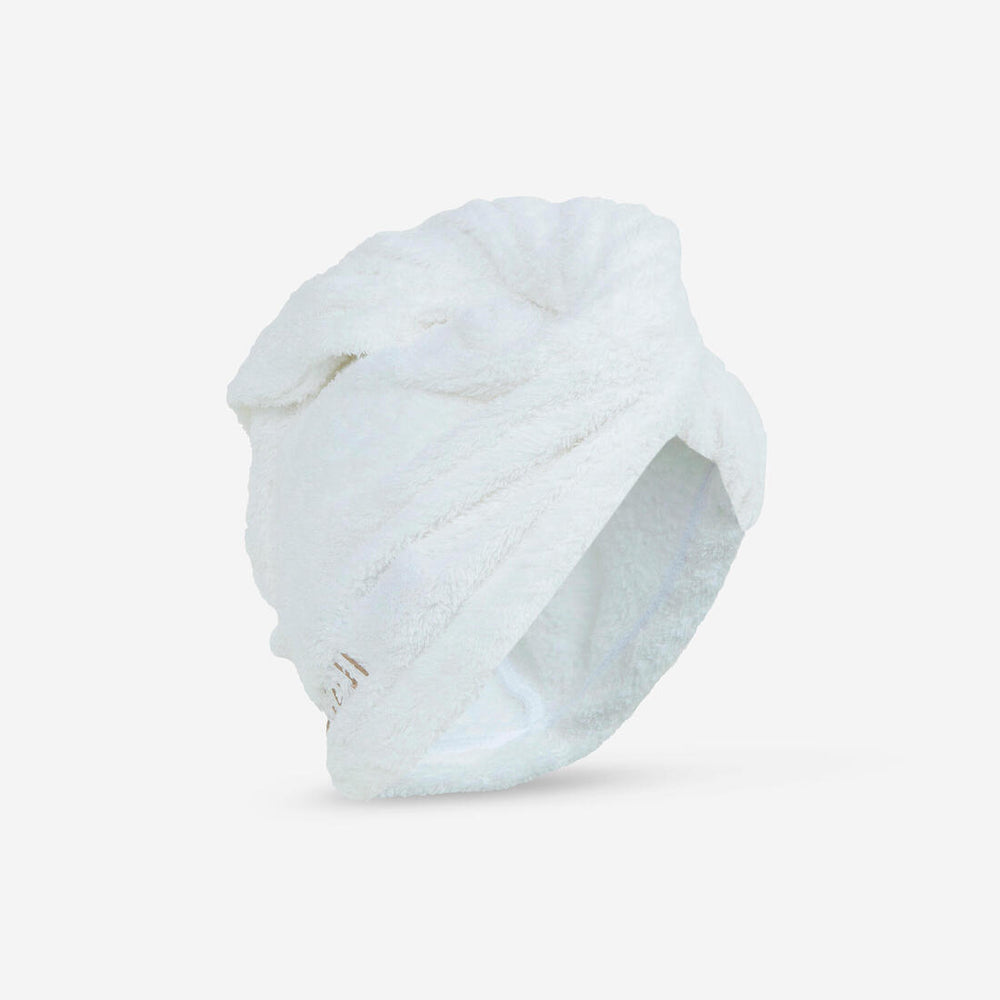 This hair towel is super soft, perfect for gently drying your hair after a swim or the shower. It's highly absorbent and dries quickly. And it wraps around your hair with a button to keep it in place.