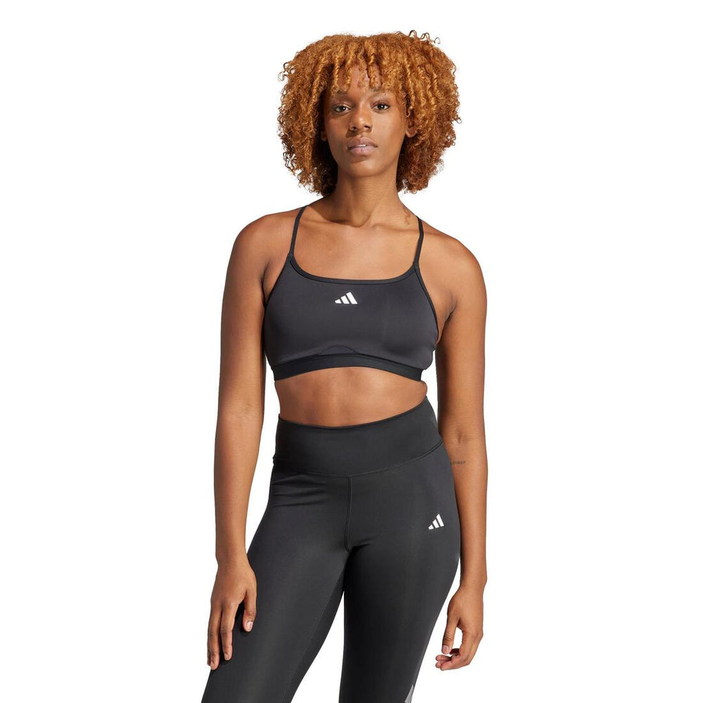 Show off your style in the gym in this light-support workout bra from adidas. It has a strappy back that pairs well with open-backed tops. AEROREADY technology wicks moisture to keep you dry when your workout heats up. Removable pads provide coverage and a customisable fit. Product Code: IQ3388
