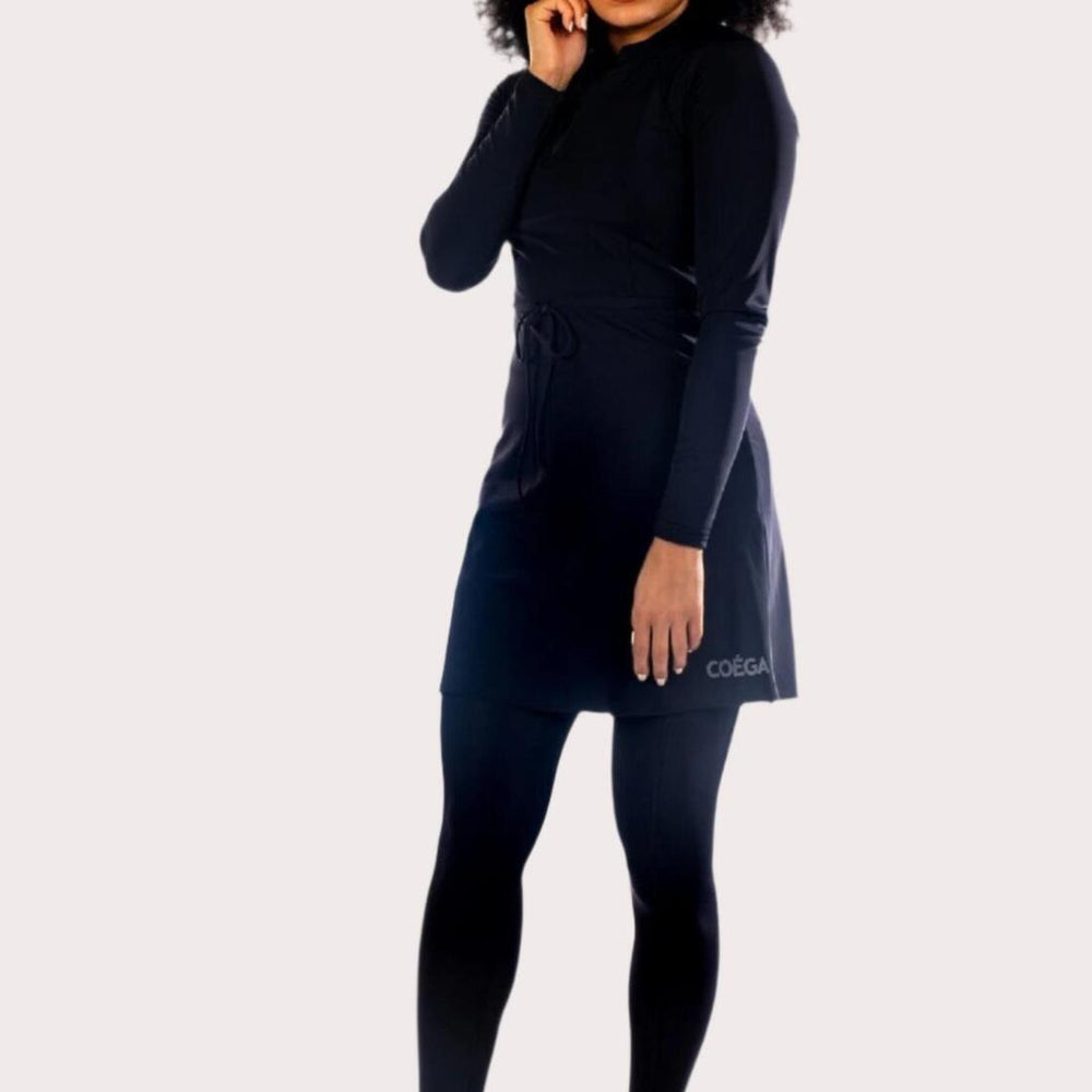 Stylish and chic, the tunic has a graceful silhouette. The skirted tunic has built-in support with bra padding and is mid-thigh in length. Long sleeves with specially designed thumb holes help keep sleeves down and allow freedom to move. Baby snaps on the inside seam secure the tunic to COEGA’s full leggings or swim trousers to prevent flare-ups. Mix and match with Tights or Trousers and Swim Shaela to suit your style. Go Ahead, Love the Sun!