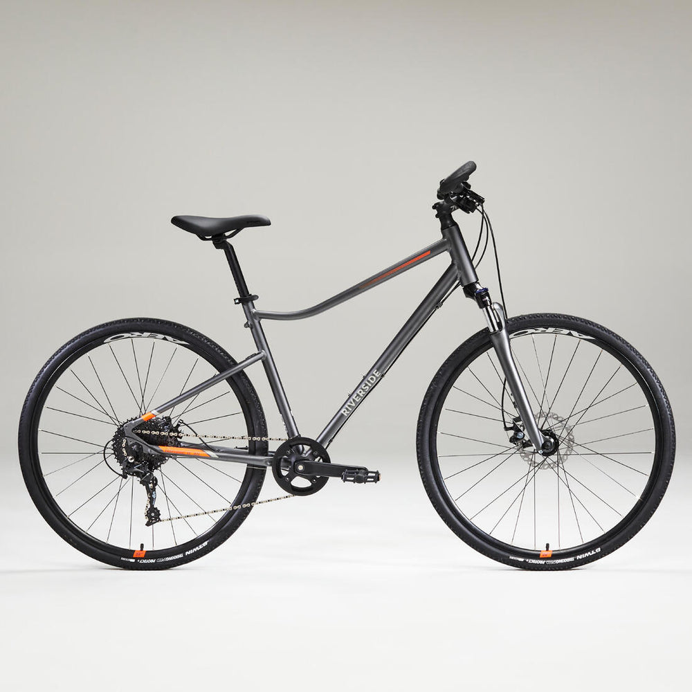 We opted for a single chainring drivetrain for ease of use and lightness. The "mega range" cassette lets you take on even taller hills than with the Riverside 500 - Microshift H100 10-speed cassette. - Single chainring: 36-tooth, interchangeable with a 34-tooth wheel (8520740) or a 38-tooth wheel (8520741). - Cogs: 11/ 40. - KMC X10 chain with quick-release. - Rear derailleur: B'Twin by Microshift RD M62-L. - Anti-derailment ring.