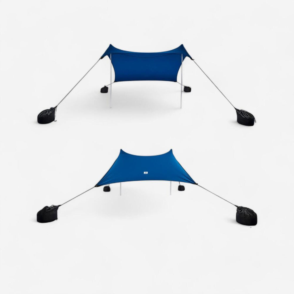 Beach shelters large enough for four adults. No need for pegs, thanks to the two aluminium tubes and four ballast bags to be filled with sand to keep the structure taut.