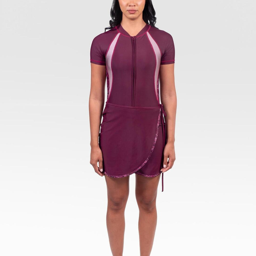 With its superior shape retention, it ensures a sleek look with lasting confidence. The Slim-Kini is designed to be customizable with built-in bra support and removable padding for flexibility. This Slim-Kini comes in short length with a sturdy front zip for easy maneuvering in and out of the suit.