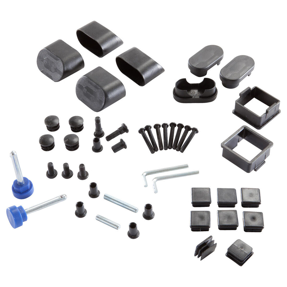 a full set of screw hardware, plastic caps, lock pins, and tools for assembly.
