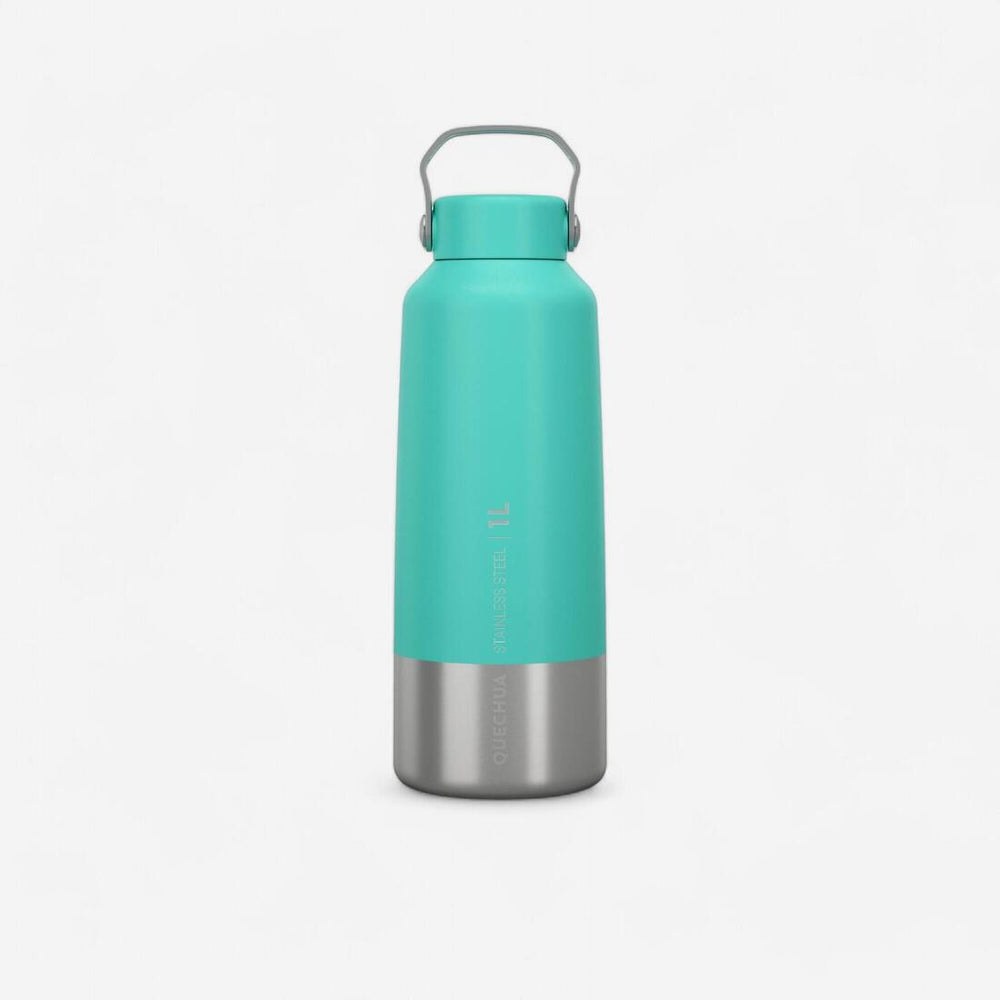 This flask is crafted entirely from stainless steel, both the body and the top. Featuring a screw cap and a carry handle, it's straightforward, robust, and accommodates 1 L of your preferred drink.